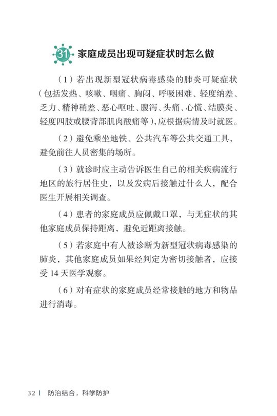 中国疾病预防控制中心编写的《新型冠状病毒感染的肺炎公众防护指南》,日前出版发行。此书聚焦公众个人与家庭防护、居家医学观察、理性就医、心理疏导等防治细节,通过问答形式解读新型冠状病毒感染的肺炎有关问题疑惑,引导公众正确认识,积极做到防治结合、科学防护、消除恐慌、理性应对。