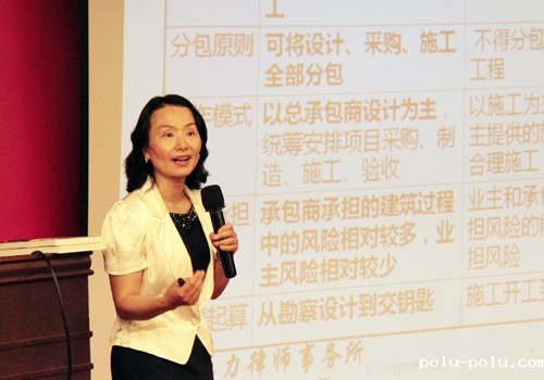 本次讲座的主题是:工程总承包模式特点及工程总承包合同亮点介绍,周月萍律师介绍了工程总承包合同与BT/BOT的渊源,工程总承包项目是否必须招投标,工程总承包合同的效力判定,工程总承包的概念、方式和发展过程,工程总承包合同(示范文本)的十二大亮点分析,从质量责任、工期责任、设计变更索赔、合同价款等方面,阐述了工程总承包模式的特点和局限性,并对施工企业签订工程总承包合同的风险防范作了提示。