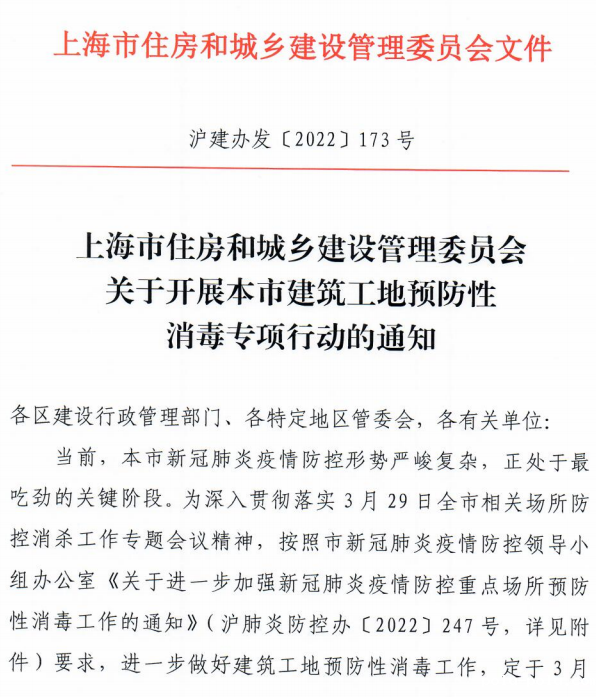 当前,本市新冠肺炎疫情防控形势严峻复杂,正处于最吃劲的关键阶段。为深入贯彻落实3月29日全市相关场所防控消杀工作专题会议精神,按照市新冠肺炎疫情防控领导小组办公室《关于进一步加强新冠肺炎疫情防控重点场所预防性消毒工作的通知》要求,进一步做好建筑工地预防性消毒工作,市住房城乡建设管理委定于3月30日起至4月29日开展本市建筑工地预防性消毒专项行动。